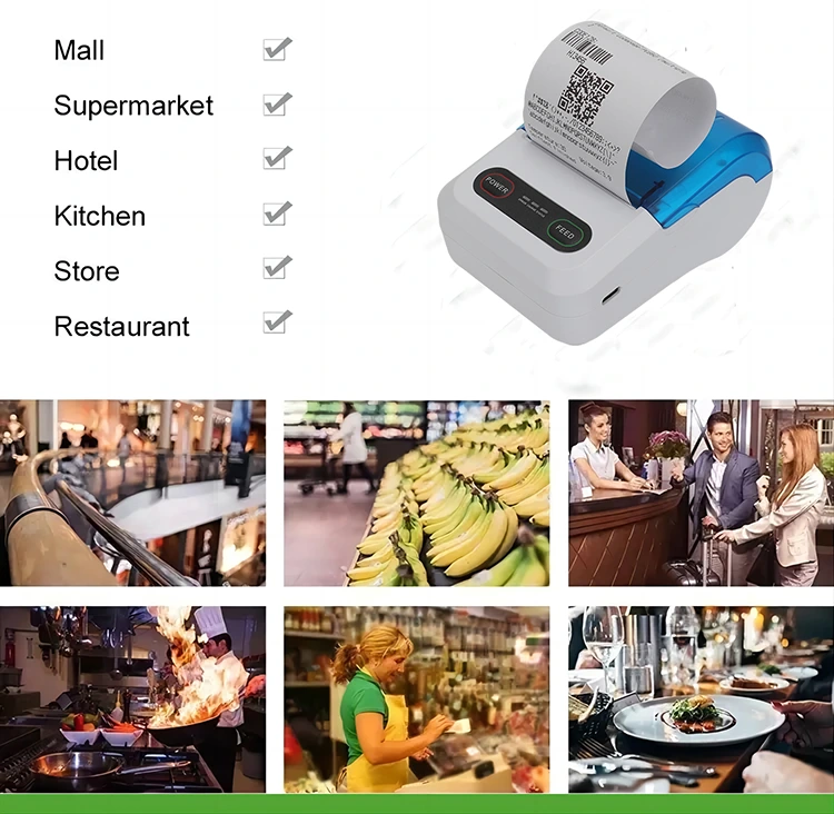 Šiluminiai „Bluetooth“ belaidžiai rašaliniai spausdintuvai tampa vis populiaresni ir plačiai naudojami įvairiose pramonės šakose, tokiose kaip mažmeninė prekyba, maitinimas, logistika ir sveikatos priežiūra. Mažmeninės prekybos pramonė gali jį naudoti, kad greitai atspausdintų pirkimo kvitus. Maitinimo pramonėje jis gali akimirksniu spausdinti užsakymus. Logistikos pramonėje jis gali spausdinti greitojo pristatymo etiketes. Medicinos pramonėje jis gali spausdinti medicininius įrašus ir receptus. Visi šie taikymo scenarijai rodo aukštą šiluminių „Bluetooth“ spausdintuvų efektyvumą ir praktiškumą.