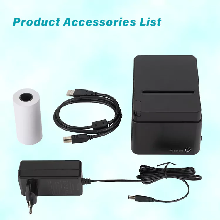 1.Pakuotę sudaro: 80 mm kvitų spausdintuvas, popieriaus ritinys, USB laidas, vadovai, adapteris.